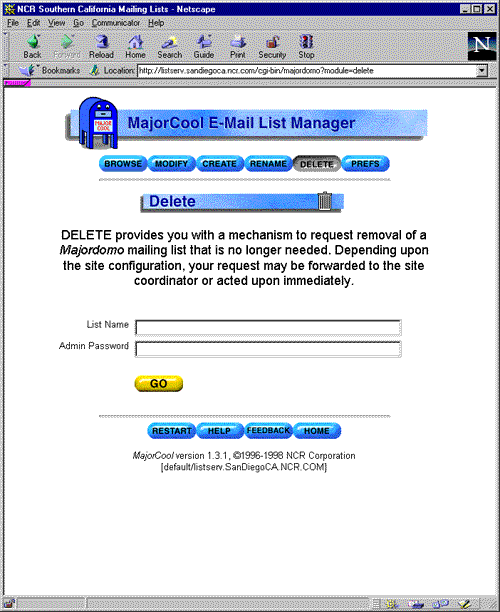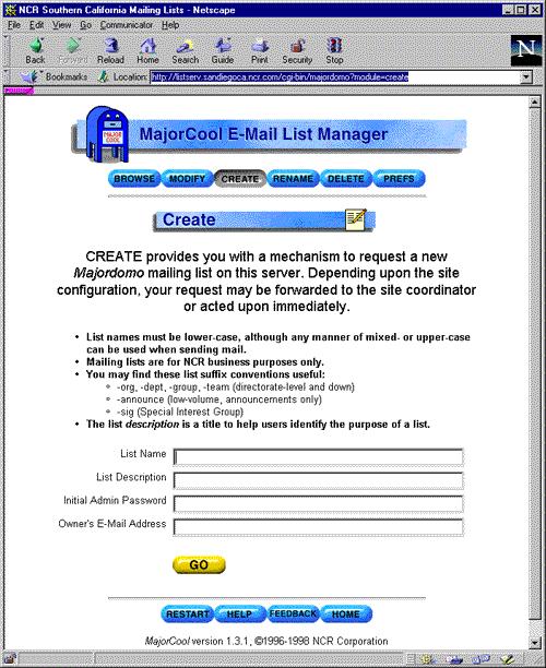 MajorCool is a Web interface to the Majordomo mailing list management tool. Whereas Majordomo is a rather unforgiving command-driven application that utilizes e-mail for effecting changes, MajorCool adds a Web-based front-end to provide a user-friendly interface to list manager operations.